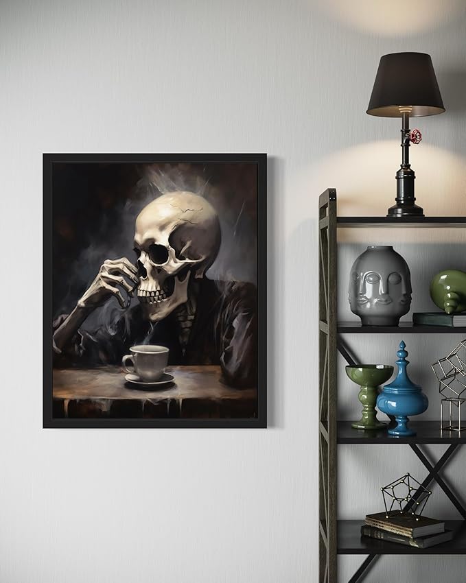 Skull Drinking Coffee Poster Art Print, Halloween Scary Vintage Wall Art Academia Spooky Painting Decoration for Horror Prints, Gothic Posters Bedroom Decor 89 (Skull Drinking Coffee, 16 x 20 inches, Unframed)