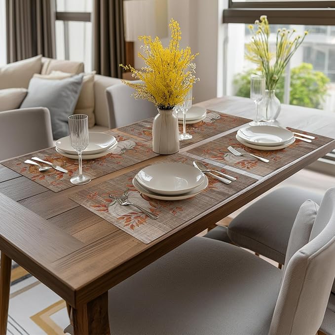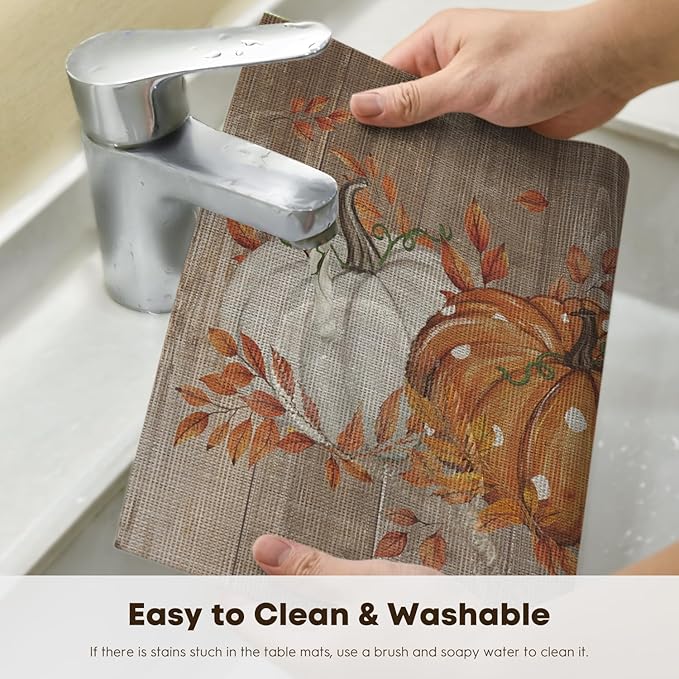 Artoid Mode Wood Pumpkin Leaves Fall Vinyl Placemats Set of 4, Wipeable Woven PVC Table Mats for Thanksgiving Farmhouse Party Kitchen Dining Decor