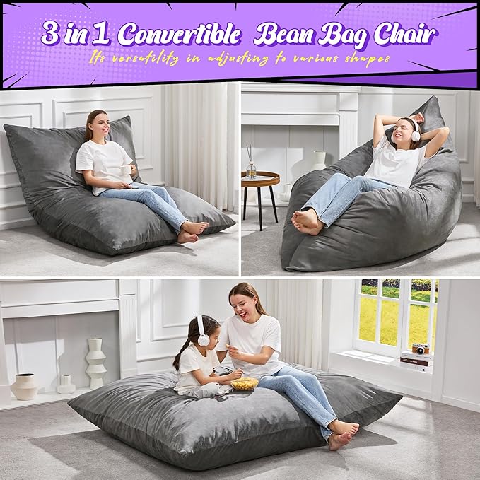 Hobestluk 3 in 1 Bean Bag Chair Giant Bean Bag Chairs for Adults with Velvet Cover Convertible Bean Bag Floor Cushion with Machine Washable Cover for Living Room (Velvet Grey)