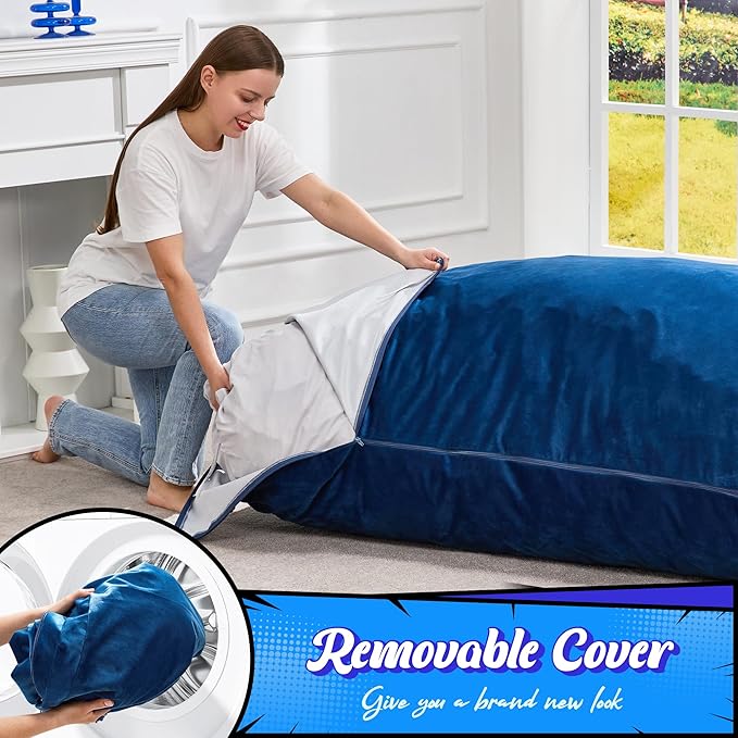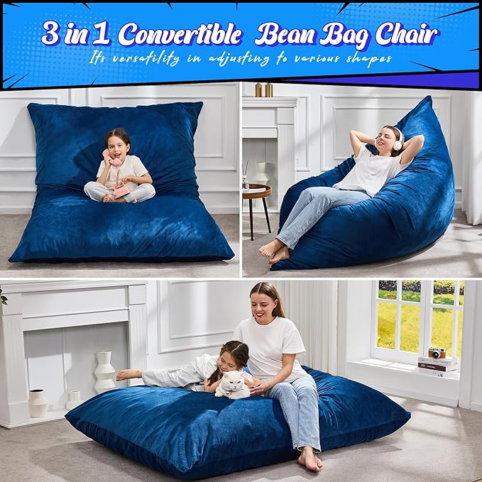 Hobestluk 3 in 1 Bean Bag Chair Giant Bean Bag Chairs for Adults with Velvet Cover Convertible Bean Bag Floor Cushion with Machine Washable Cover for Living Room (Velvet Blue)