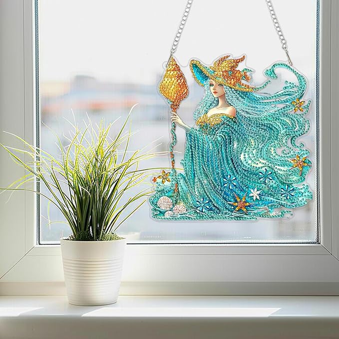 SENQAO Fairy Diamond Art Hanging Kit for Adult, Special Shaped Rhinestone, Double Sided DIY Acrylic Diamond Art Painting Window Pendants Home Garden Wall Hanging Kits Hanging Ornament (Shell Witch)