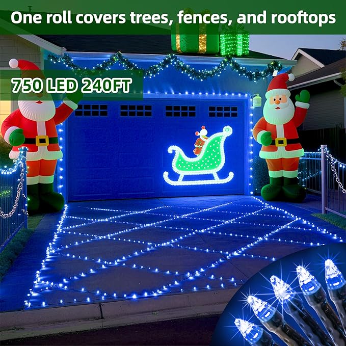 - Perfect for Large Homes: Tired of connecting multiple strands? This 240ft 750 LED Blue outdoor Christmas string lights on dark green wire is long enough to wrap your garage, windows, roofline, porches, and even 15–20ft Christmas trees. One continuous strand surrounds your home in a calm, magical glow reminiscent of a peaceful winter night.