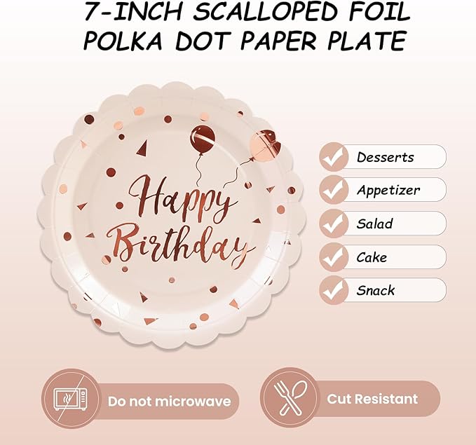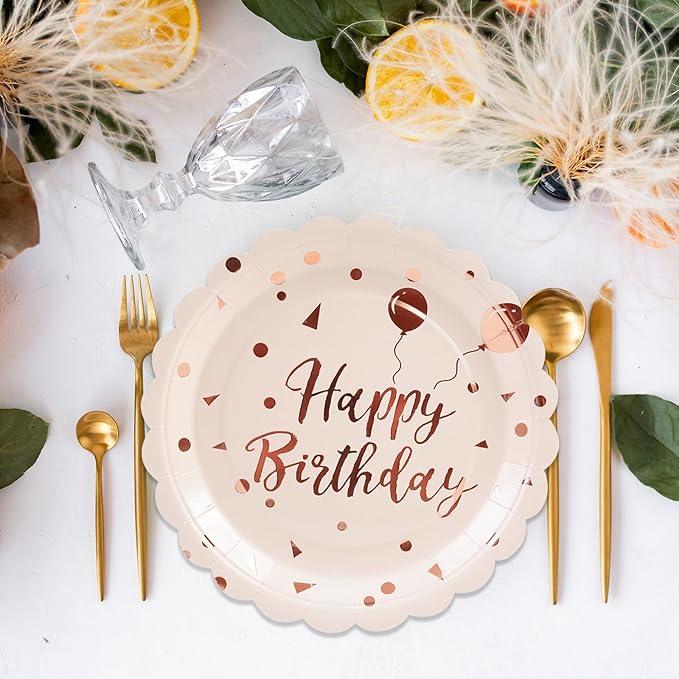 - 【EXQUISITE DESIGN】:Eye-catching gold foil stamping of 'Happy Birthday' in stylish fonts adorns these birthday dessert plates and the rising balloon signifies growing goodness. An elegant rose gold color specially designed for girls and ladies adds a touch of elegance and festivity, making your birthday party table instantly stand out.