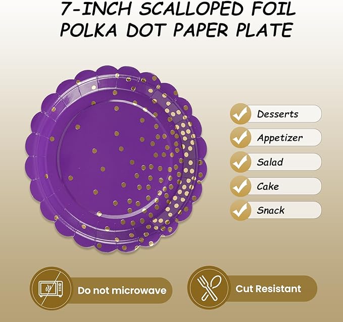 50PCS Purple Paper Plates, 7 Inch Scalloped Purple and Gold Party Plates Disposable Foil Polka Dots Dessert Plate Cake Plate for Wedding Baby Shower Birthday Anniversary Bachelorette Dinner BBQ