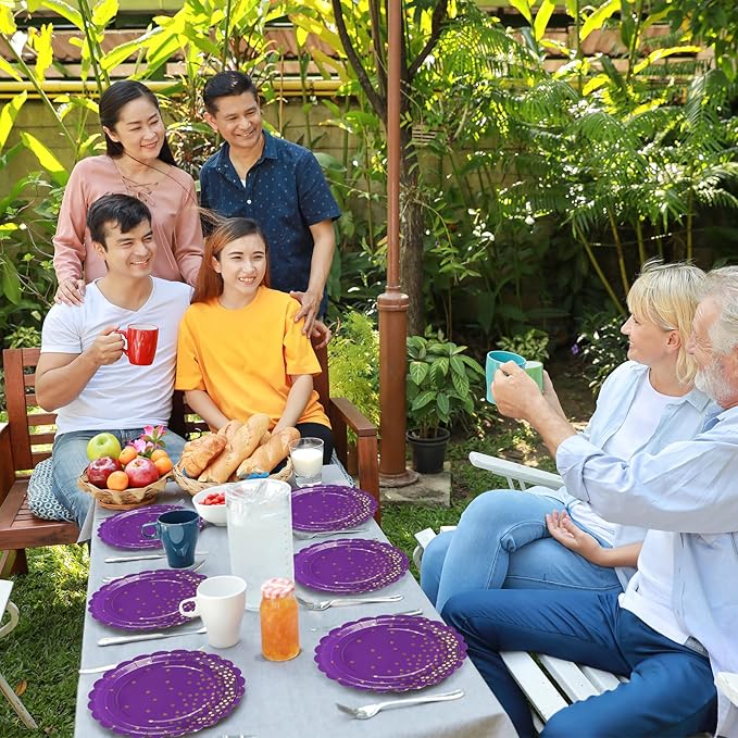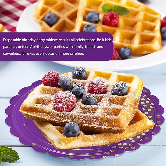 - 【PURPLE PARTY DECORATIONS】: Purple party plates set comes with 50pcs purple paper plates, serve up to 50 guests, specifically for dessert plates size: 18cm/7inch, gold foil paper plates are exquisite and generous, the perfect party addition you've been looking for a guaranteed hit!