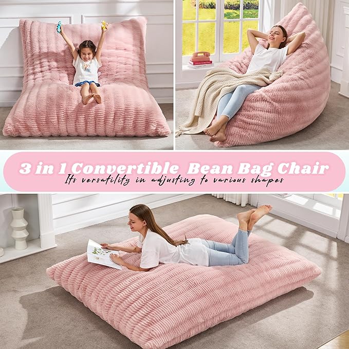 Hobestluk 3 in 1 Bean Bag Chair Giant Bean Bag Chairs for Adults with Ripple Cover Convertible Bean Bag Floor Cushion with Machine Washable Cover for Living Room (Ripple Pink)