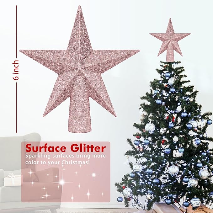 Tree Topper Star, 6" Rose Gold Christmas Star Tree Topper Accessories, Xmas Glitter 3D Bethlehem Tree Topper Ornament, Waterproof Holiday Christmas Tree Topper Star Decor for Home Indoor Outdoor