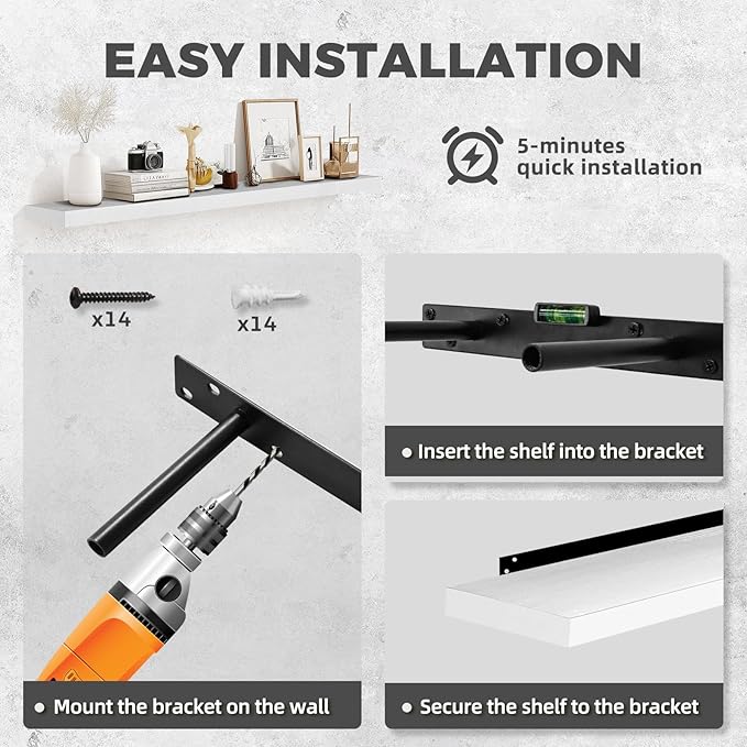 - Stable Floating Brackets: The shelves include hidden steel brackets for secure and wobble-free support. This clean floating look seamlessly blends into any room, whether it’s the living room, kitchen, or office