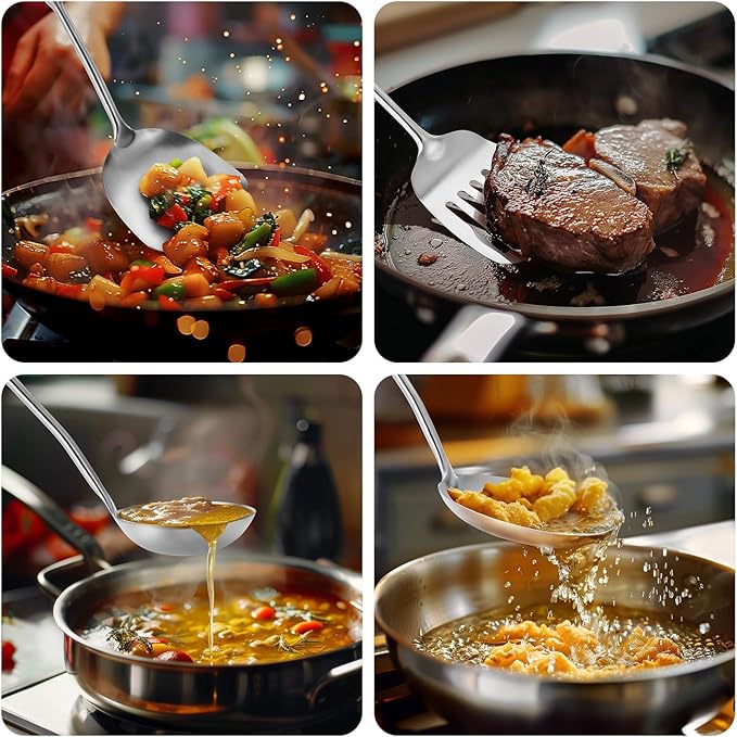 - 4 PCS Wok Tools Set: 15-inch 304 stainless steel wok spatula,slotted spatulas,ladle and skimmer sadle are longer than typical wooden cookware.Sufficient length ensures that our hands are kept away from the hot frying pan while we make delicious meals with ease