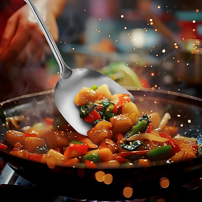 - 2 PCS Wok Tools Set: 15-inch 304 stainless steel spatula and ladle are longer than typical wooden cookware.Sufficient length ensures that our hands are kept away from the hot frying pan while we make delicious meals with ease
