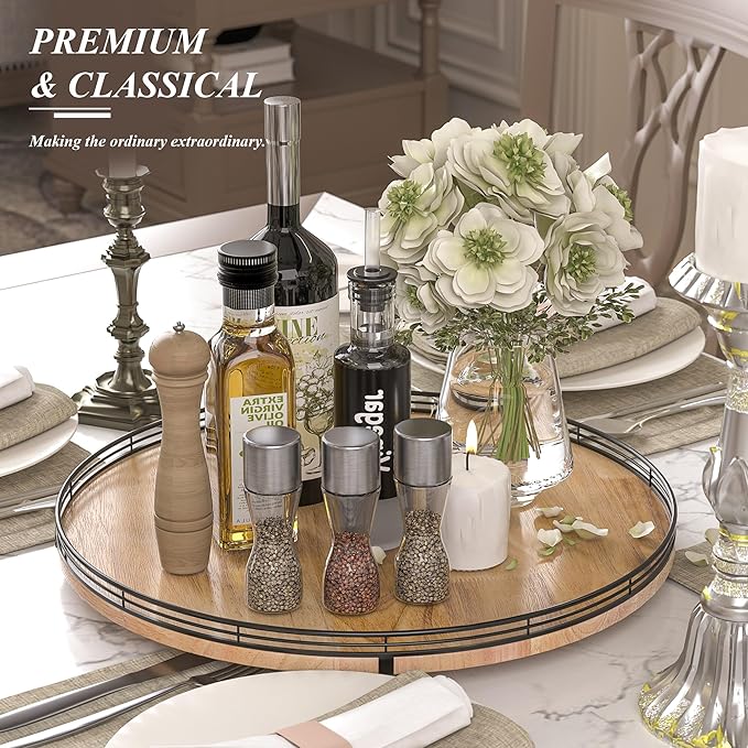 - UPDATED DESIGN: With larger wood base on this lazy Susan for table top, the turntable organizer doesn't wobble, even with heavier items on it. With premium oak wood and classical iron fence make this lazy Susan turntable stylish, functional and adding a touch of rustic charm. it’s also very easy to clean. There are included anti-slip pads on the bottom of the lazy Susan for extra surface protection.