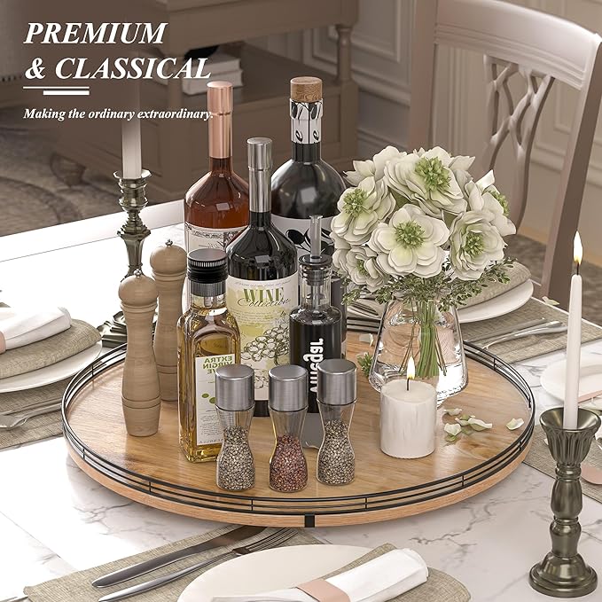- UPDATED DESIGN: With larger wood base on this lazy Susan for table top, the turntable organizer doesn't wobble, even with heavier items on it. With premium oak wood and classical iron fence make this lazy Susan turntable stylish, functional and adding a touch of rustic charm. it’s also very easy to clean. There are included anti-slip pads on the bottom of the lazy Susan for extra surface protection.