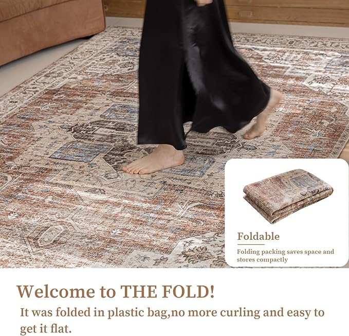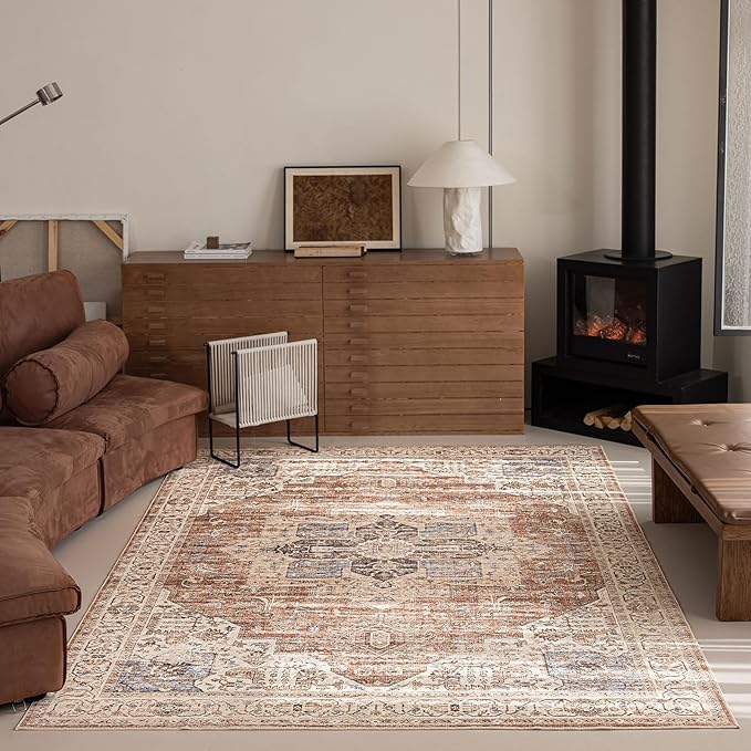 6'x9' Area Rug - Vintage Persian Medallion Design Low-Pile Faux Wool Rug, Non-Slip Backing, Machine Washable, for Living Room, Dining Room, Bedroom (Brick Red)