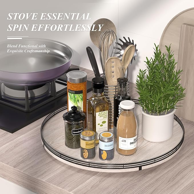 - 360 RATATING & MAXIMIZE SPACE: The base is made of solid wood and the spinning mechanism is made of steel ball bearings, which are well-built and allow for 360° smoothly spin. Making it super easy to access items at the back of your cabinet without having to remove everything in front. You can use it to store spices, condiments, and even small jars, and it keeps everything neatly in place.