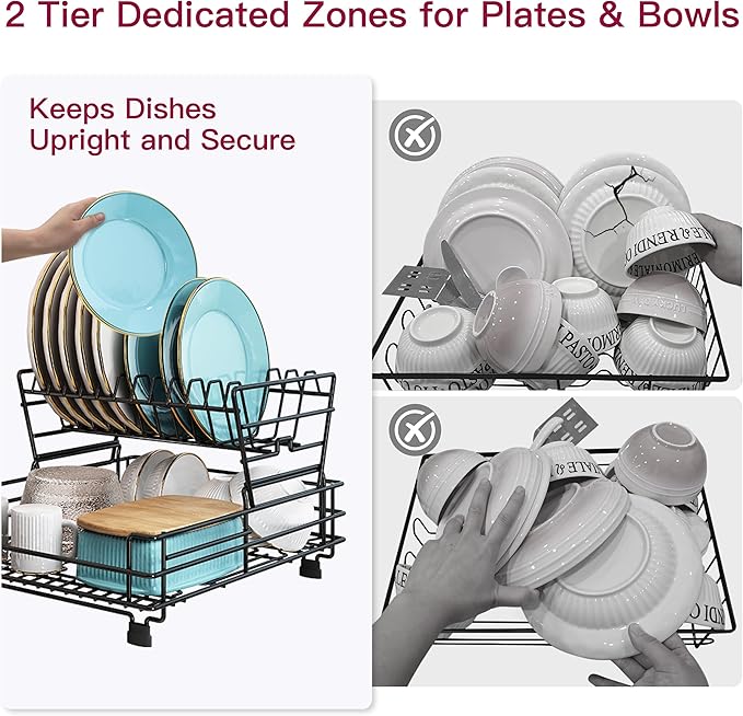 - ๐ 2-Tier Dish Rack for Kitchen Counter Storage: Dedicated zones for plates, bowls, and utensils. Sturdy frame prevents tippingโdish drainer rack keeps everything upright and secure