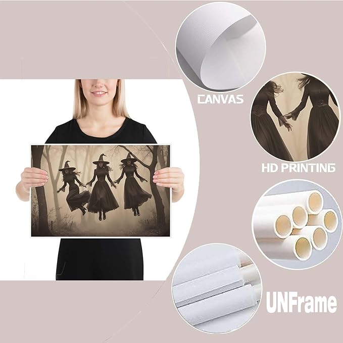 JFHCQJPK Three ghost witches flying in vintage forest gothic wall art witchcraft decoration holiday gift canvas wall art print28x40in Frameless