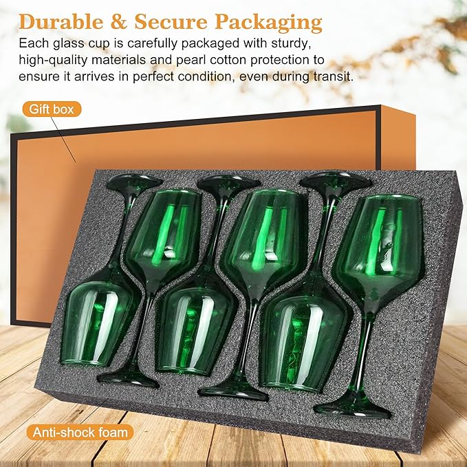 - 【Elegant and Secure Packaging】Glazvia unique wine glasses is carefully packaged in an elegant and durable box to ensure safe delivery. The sturdy packaging protects the Green glasses drinkware during shipping, so you can be confident they will arrive in perfect condition. Whether purchasing for personal use or as a wine glasses gift set, this thoughtful packaging adds an extra touch of sophistication, making the unique wine glasses set of 6 as an wine glass gifts for women.