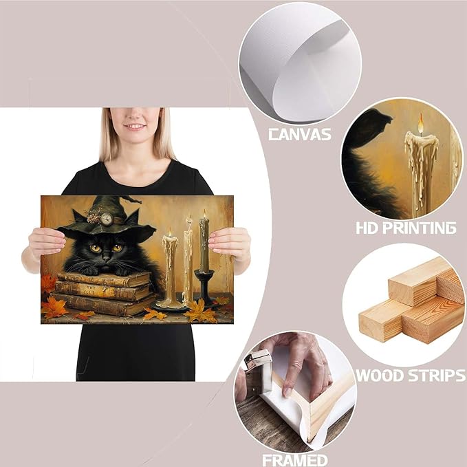 Vintage Halloween wall decoration black cat and magic book suitable for home bedroom living room decoration dark classic art witch wall decoration12x16in Wood Framed