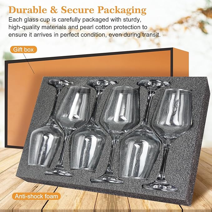 - 【Elegant and Secure Packaging】Glazvia unique clear wine glasses is carefully packaged in an elegant and durable box to ensure safe delivery. The sturdy packaging protects the glasses drinkware during shipping, so you can be confident they will arrive in perfect condition. Whether purchasing for personal use or as a clear wine glasses gift set, this thoughtful packaging adds an extra touch of sophistication, making the unique clear wine glasses set of 6 as an wine glass gifts for women.