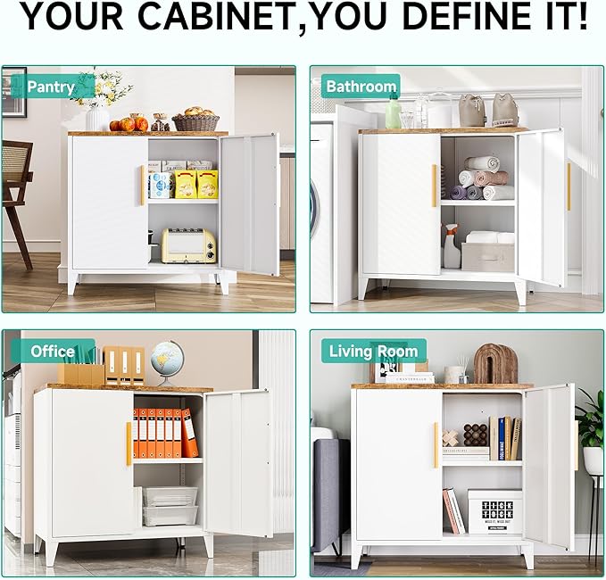 - 【Large Capacity with 3 Tier】: White storage cabinets have 2 tier inside and wood top for you to store kinds of daily use,sundries,toys,tools,food,kitchen appliances and supplies.Let you organize your space like a pro. Save your home from the villainy of clutter.