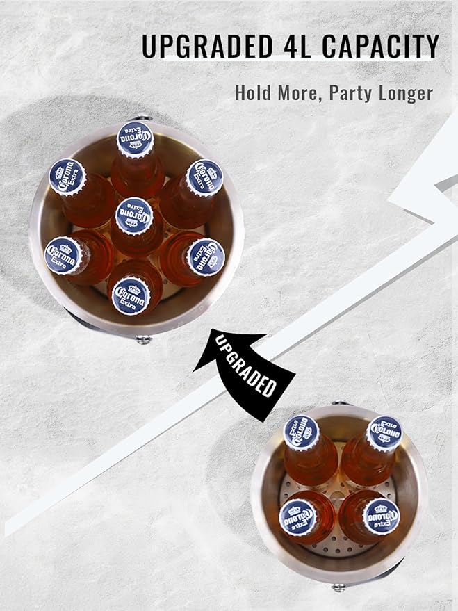 - PARTY PERFECT: This 4L large ice bucket is ideal for parties, home bars, picnics, BBQs, beaches, patios, restaurants, pool parties, weddings, graduations, and more. Keep cocktails, wine, champagne, whiskey, vodka, beer, and soda perfectly chilled. Stay cool this summer with our ice bucket for parties with lid