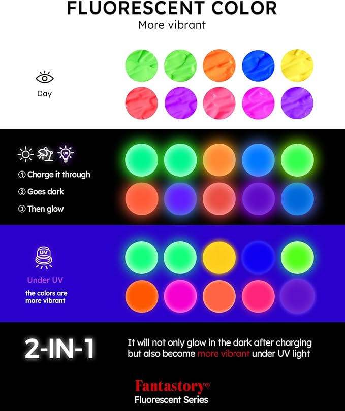 - Fluorescent Series Set: These vibrant neon paints are eye-catching during the day and reflect brilliantly under black light. They also glow in the dark for several minutes after being charged. -(Charge with a black light for optimal results.) For Halloween, Fantastory glow paints can add a spooky atmosphere to your crafts. It’s the great option for imaginative people and those who love spooky and creative Halloween crafts.