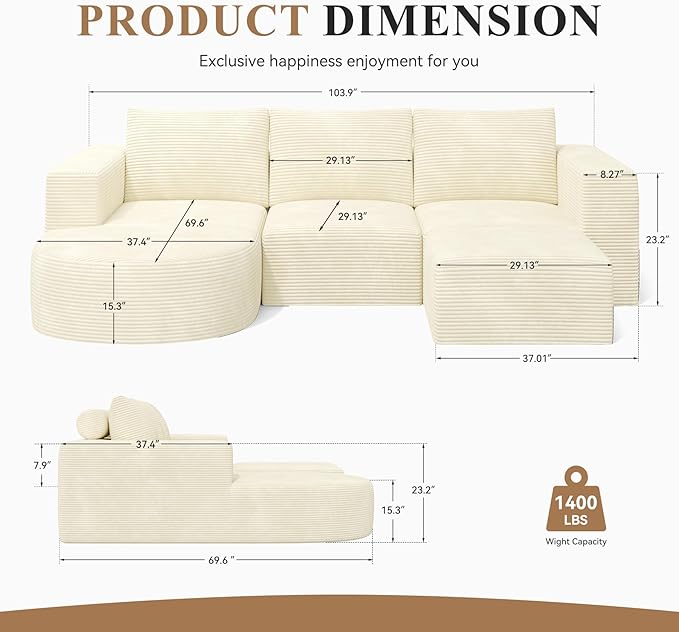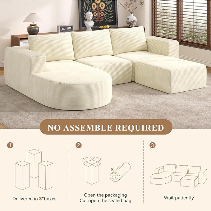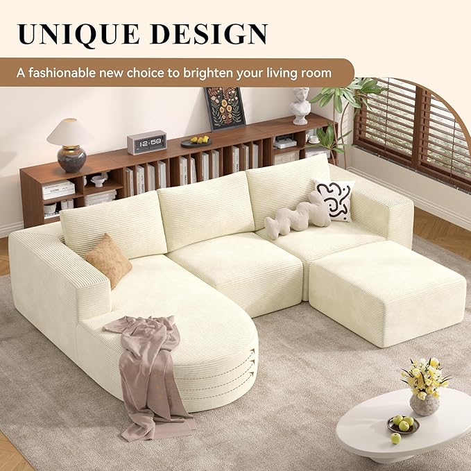 Modular Sectional Sofa with L-Shape Chaise,Cloud Sectional Modern Sleeper Couch with Deep Seat,Sponge Compression Sofas No Assembly Required (Beige-Corduroy Fabric) 1pcs