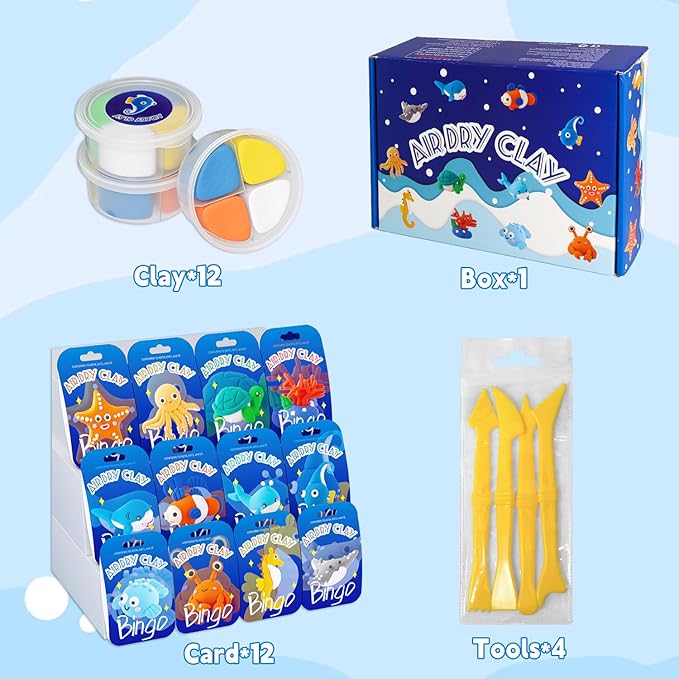 - 【Colorful and Cute Marine Fish Style】Dried clay kit packaged in 12 boxes,each jar has 4 compartments filled with different colors,enough clay to shape 12 themed models,12 different clay sets for marine creatures, helping kid develop fine motor skills and enhance hand eye coordination.