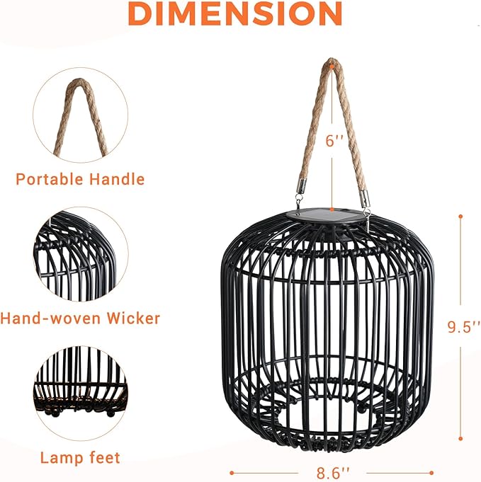 - HANDWOVEN DESIGN: Crafted with handwoven natural/black wicker in elegant openwork patterns, this outdoor lantern features a removable jute rope handle for versatile tabletop/ground/ hanging display. The intricate weave blending retro charm with warm glow for romantic decor