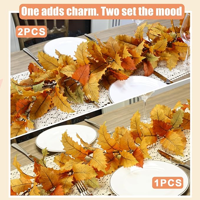 - Perfect Fall Decor for Any Space:Each fall leaf garland measures 6 feet,making it ideal for decorating a variety of spaces, from your outdoor porch and dining table to your mantel, door, wall, kitchen, or fireplace. Whether you drape it over your mantel, hang it around doorframes, or wrap it around stair rails, this autumn garland’s flexibility lets you easily create the perfect fall ambiance in any room or outdoor setting