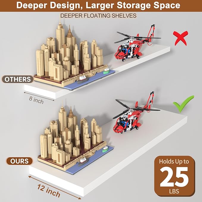 - 【Extra Deep 12" Storage】- These deep floating shelves for wall provide 12-inch depth for generous storage of books, decor, and kitchen essentials. Their expanded surface area maximizes organization while keeping items within easy reach. Perfect for displaying collectibles or storing daily necessities!