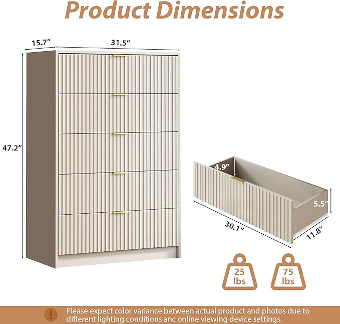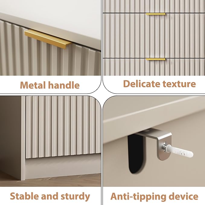 • Safety & Stability: Our fluted dresser features a dual anti-slip design, ensuring drawers stay securely in place, while anti-tipping straps provide added stability. The reinforced base and smooth damping system enhance structural integrity, offering reliable support for everyday storage needs.