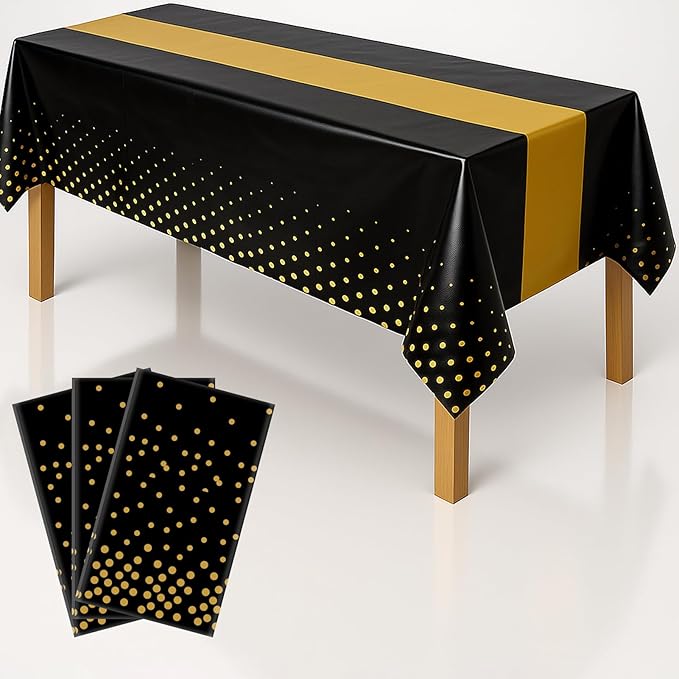 - Black & Gold Tablecloth Set: Your package includes 3 premium plastic table covers measuring 54" x 108" - ample size for standard 8-foot tables. These stunning gold-and-black disposable covers serve as ideal graduation party decorations for 2025, while also being perfect for baby showers, birthday celebrations, holiday gatherings, gender reveal parties, and other special events.