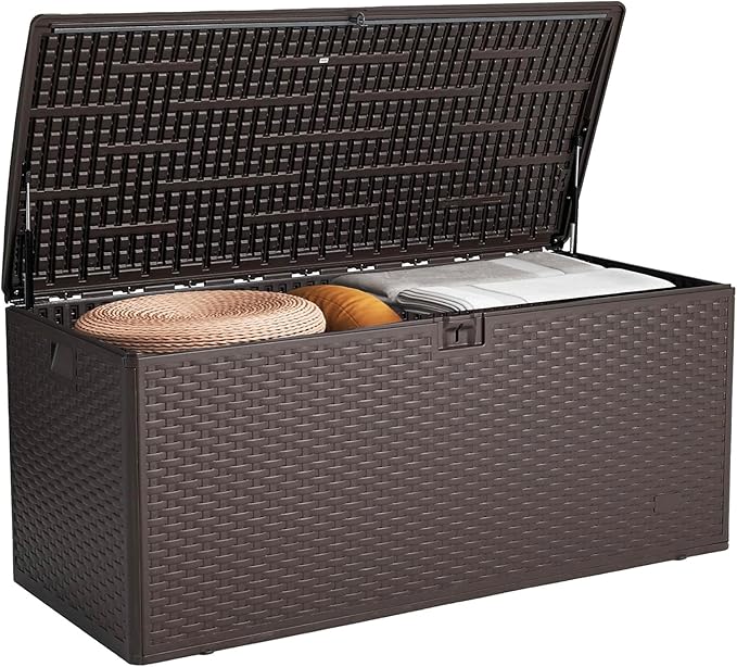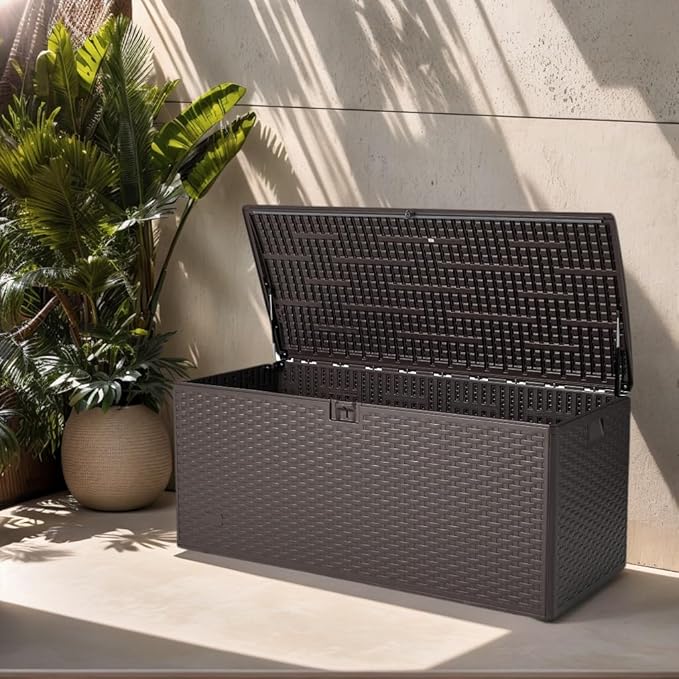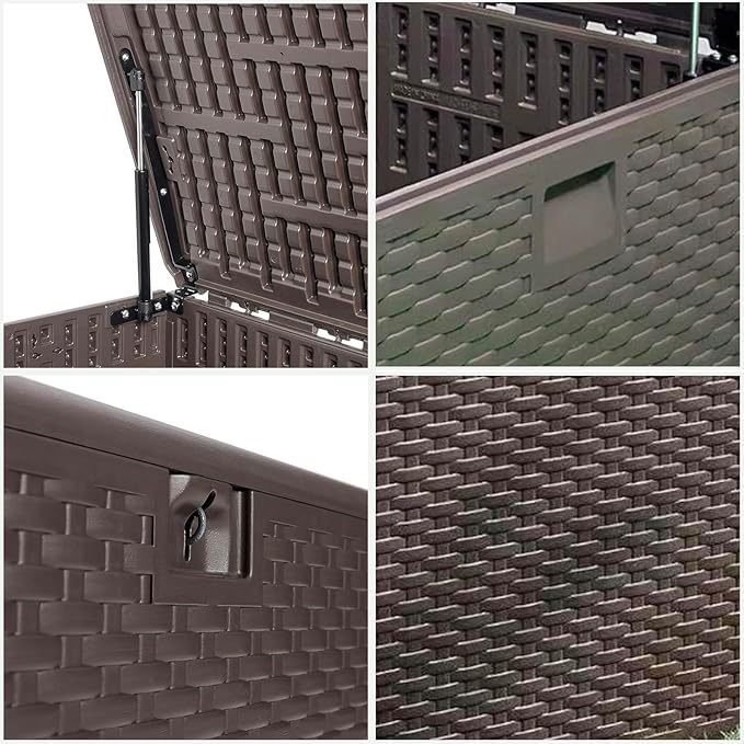 - Stylish Wicker Design:Featuring an elegant brown wicker pattern, this versatile deck box adds a sophisticated touch to your patio, garden, backyard, or indoor spaces like garages and basements, seamlessly complementing any outdoor or indoor decor