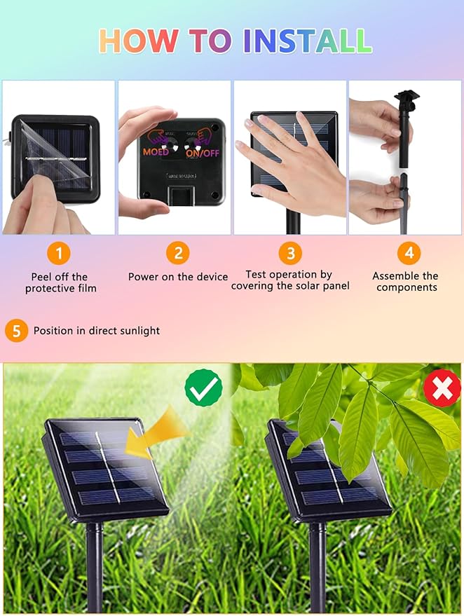 - Waterproof Solar Tree Lights and Easy to Install: With an IP65 waterproof design, the solar powered Christmas lights can withstand all kinds of weather and are a great choice for outdoor decorations, such as porch, roof, tree, yard and fence. And the lights can be installed easily—simply attach the ground stake to the solar panel and place it in a sunny spot