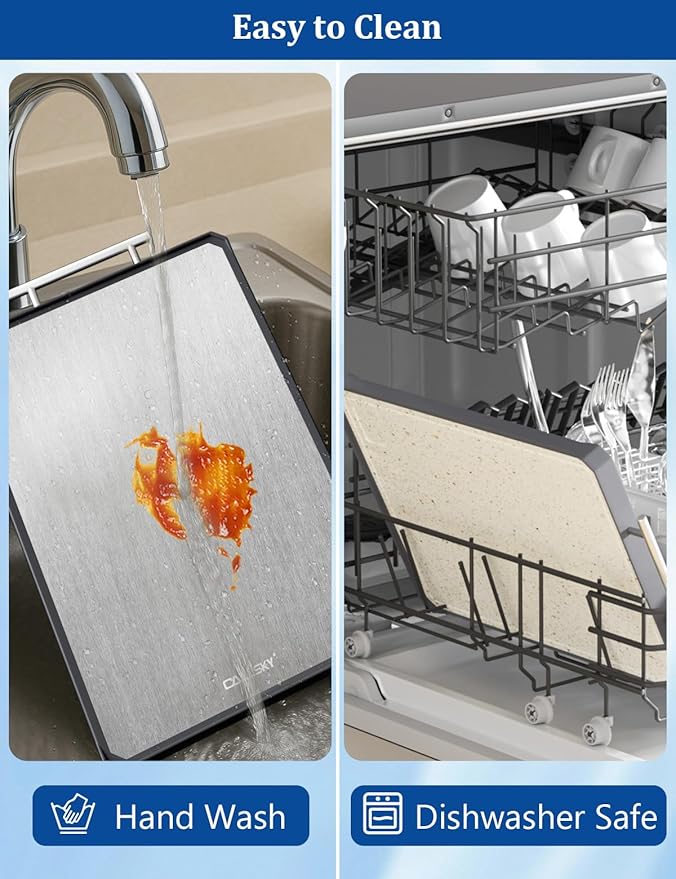 - 【Easy to Clean & Store】Both sides of the board are resistant to stains and compatible with dishwashers. Simply rinse or place it in the dishwasher after use. The integrated handle makes it easy to carry, hang, or store—helping you keep your kitchen organized