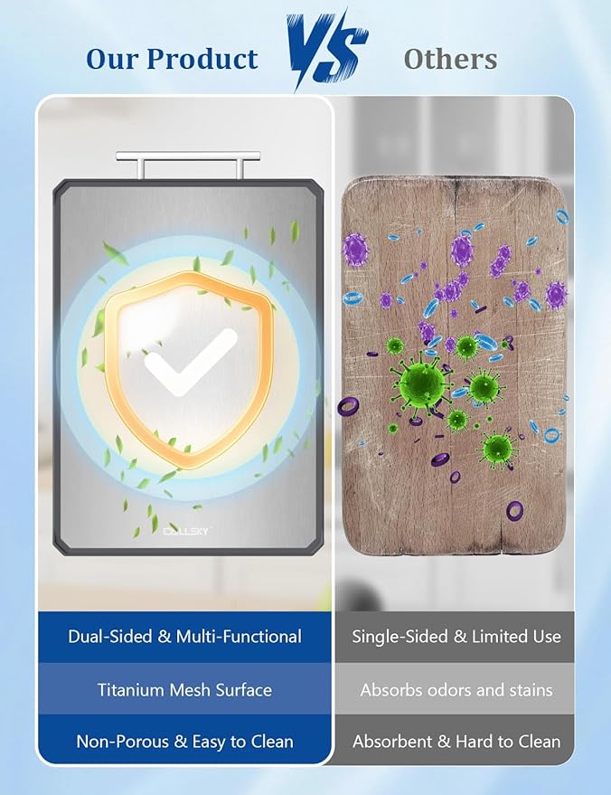 - 【Well-Constructed for Daily Use】The titanium surface includes a mesh texture that feels smooth and easy to use. Its non-porous finish resists odors and buildup, making cleanup more convenient on both sides after chopping, slicing, or carving