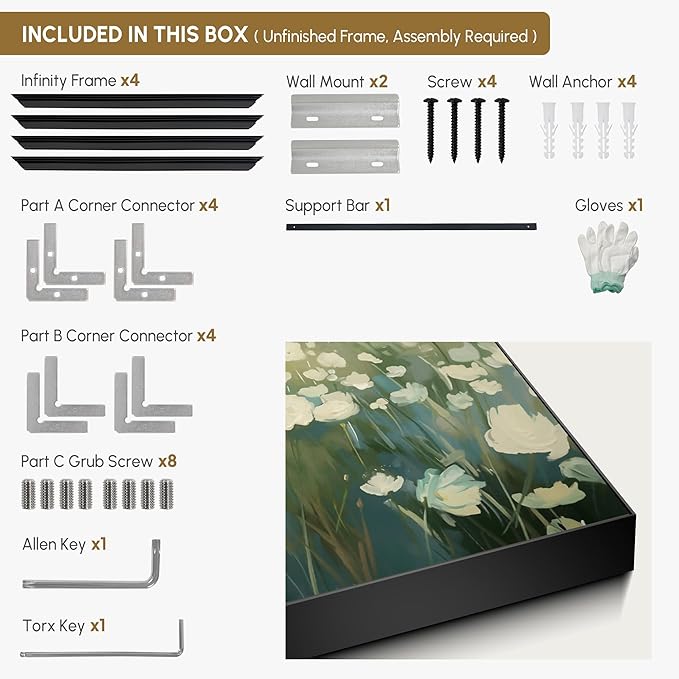 - Assembly Required: The artwork comes with the frame components unassembled. Don’t worry — setup is straightforward and tool-friendly. For best results and accurate alignment, we recommend two people to ensure a smooth assembly and a stable, secure wall mount.