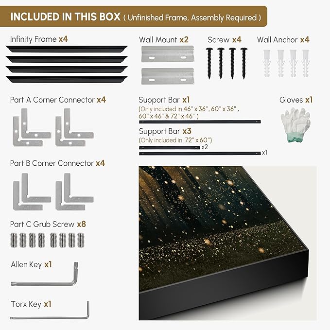 - Assembly Required: The artwork comes with the frame components unassembled. Don’t worry — setup is straightforward and tool-friendly. For best results and accurate alignment, we recommend two people to ensure a smooth assembly and a stable, secure wall mount.