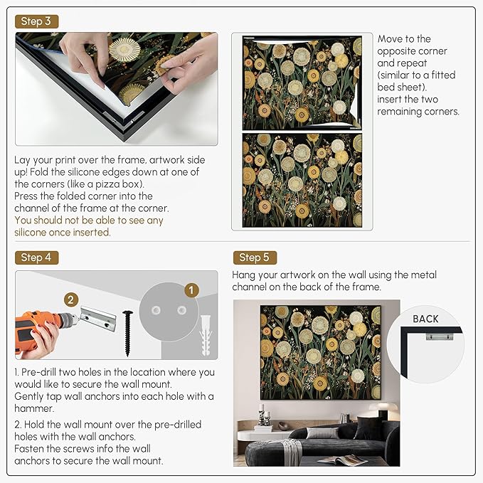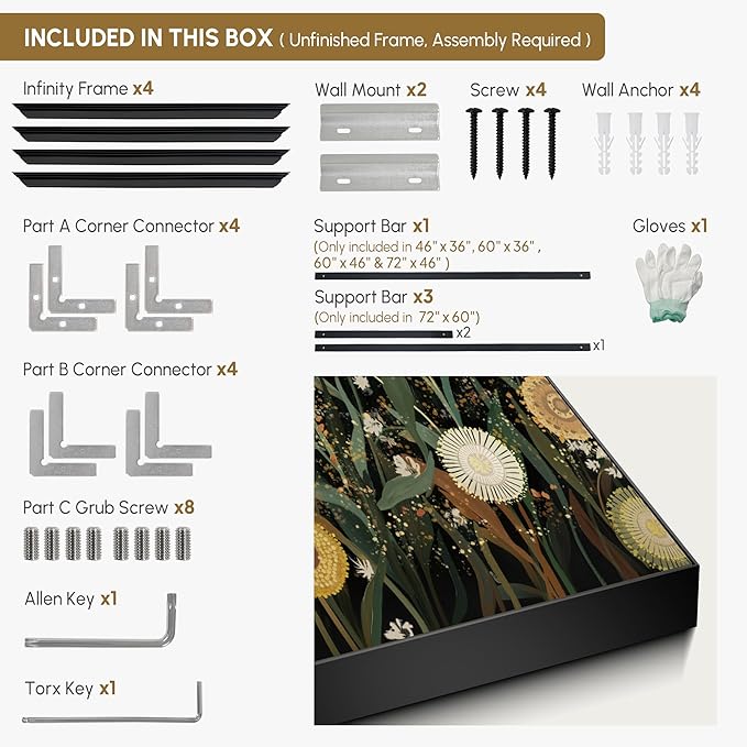 - Assembly Required: The artwork comes with the frame components unassembled. Don’t worry — setup is straightforward and tool-friendly. For best results and accurate alignment, we recommend two people to ensure a smooth assembly and a stable, secure wall mount.