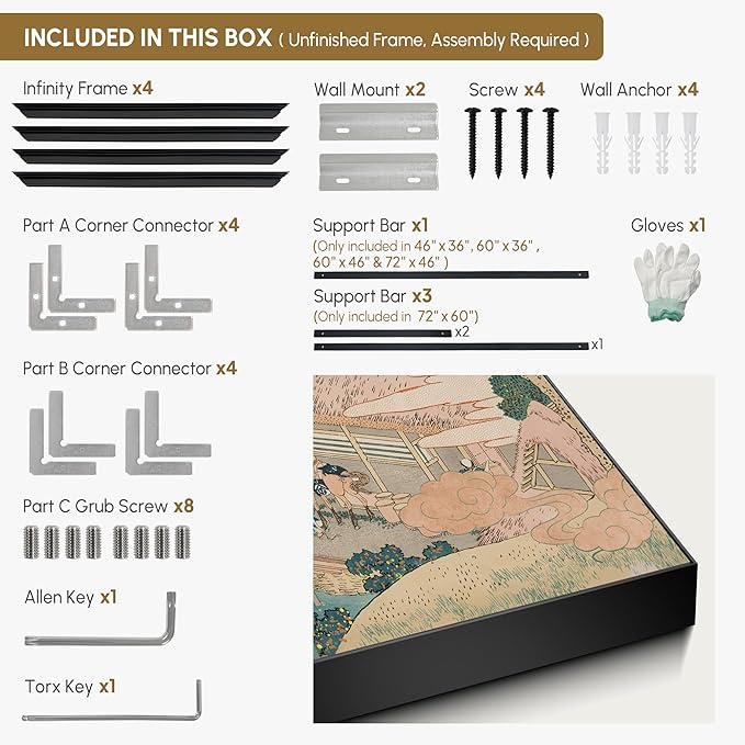 - Assembly Required: The artwork comes with the frame components unassembled. Don’t worry — setup is straightforward and tool-friendly. For best results and accurate alignment, we recommend two people to ensure a smooth assembly and a stable, secure wall mount.