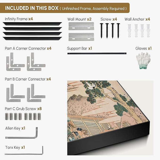 - Assembly Required: The artwork comes with the frame components unassembled. Don’t worry — setup is straightforward and tool-friendly. For best results and accurate alignment, we recommend two people to ensure a smooth assembly and a stable, secure wall mount.