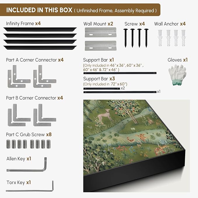 - Assembly Required: The artwork comes with the frame components unassembled. Don¡¯t worry ¡ª setup is straightforward and tool-friendly. For best results and accurate alignment, we recommend two people to ensure a smooth assembly and a stable, secure wall mount.