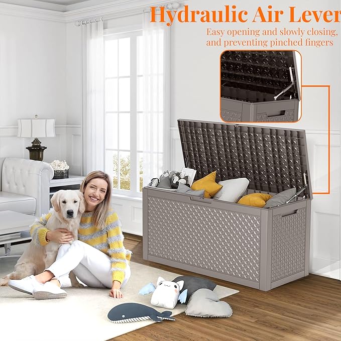 - TRANSFORM YOUR SPACE: Whether used indoors as a laundry storage solution or outdoors for patio items like cushions, garden tools, this patio storage box excels. Its multi-functional design makes it suitable as a side table, patio seat, storage bench, or footstool