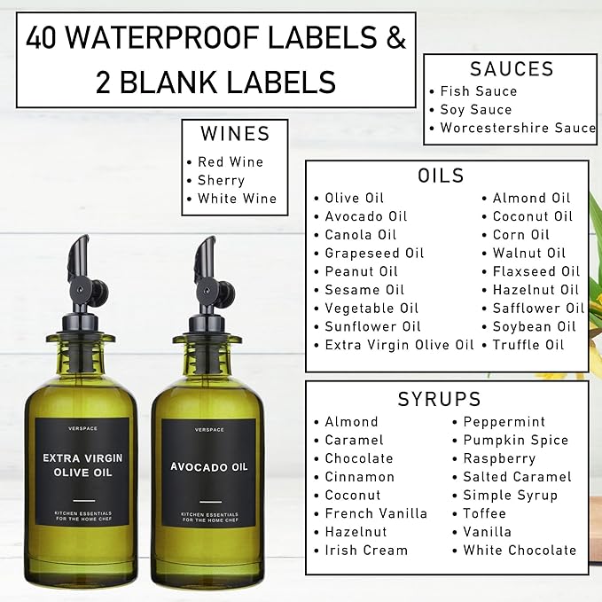 - THE ULTIMATE OIL BOTTLES FOR KITCHEN ORGANIZATION: Designed for minimalists and modern chefs, this oil dispenser for kitchen includes 2 bottles, 2 drip-free stainless steel spouts, a funnel, and 42 waterproof labels. Everything you need for a clutter-free, chic cooking space.