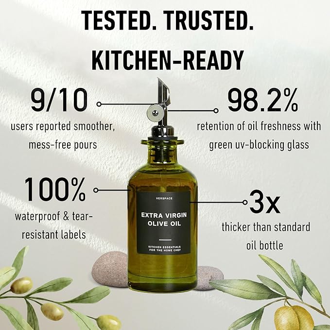- PROTECT YOUR OIL IN STYLE: This elegant green olive oil bottle set is crafted from UV-blocking glass to preserve flavor, nutrients, and freshness. Whether you're storing extra virgin olive oil or avocado oil, your oils stay safe from sunlight and oxidation.