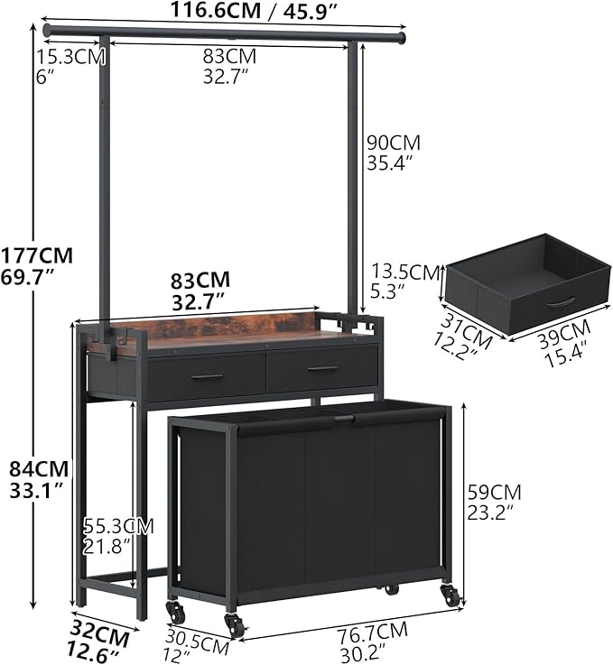 - [Easy Assemble & Reliable Construction] The entire laundry hamper consist of two pieces which are respectively console table with drawers and rolling laundry bags. Both of them utilized powder-coated steel tube as structure, especially the laundry basket choose round tube to reduce wear and tear on fabric. The package comes with clear assembly instructions and numbered parts, you will get a rolling laundry hamper in 30 Minutes.