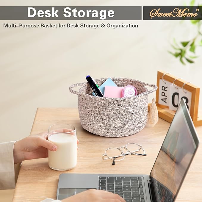 - 【Compact & Versatile – Fits Anywhere You Need It】Sized at 8"x4.7", this mini storage basket sits beautifully on vanities, nightstands, entryway tables, desktops, or shelves. Perfect for organizing makeup brushes, jewelry, skincare, toys, or even as a small plant basket or bedside catch-all for glasses and keys.