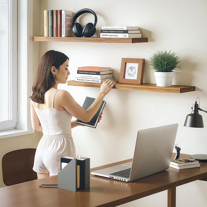 - GREAT FOR ANY ROOM: Our wood floating shelves are made of MDF with a frosted surface texture for a mordern feel that blends perfectly into a variety of different scenes; Having this large floating shelf not only for its decoration effect, but also for its high practicality; It can be used for organizing all household rooms, such as bedroom, living room, study, toilet, cloakroom, even kitchen and warehouse