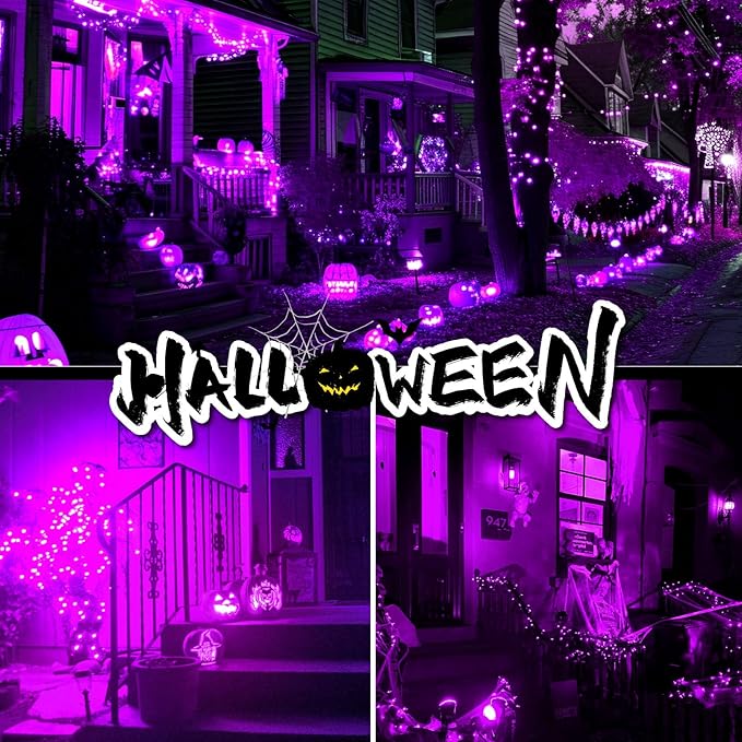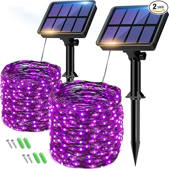 - 2 Packs Solar Halloween Lights Outdoor: Each Ultra-Bright fairy lights solar with 80LED 33FT (26.5ft light string +6.5ft lead wire), total 160LED with purple light beads, emitting a Spooky and wonderful light, creating an atmosphere of mystery and horror for Halloween party